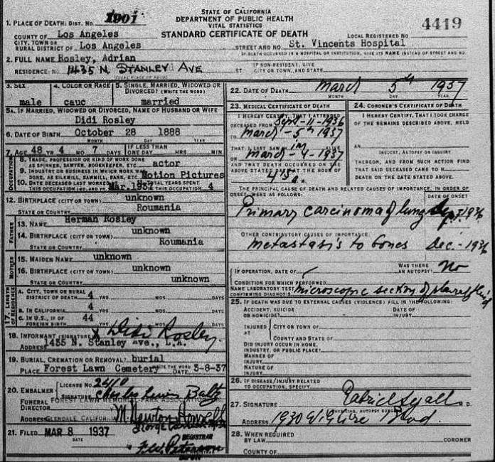 05 March 1937 Los Angeles, California, United States of America (lung cancer, age 49) |