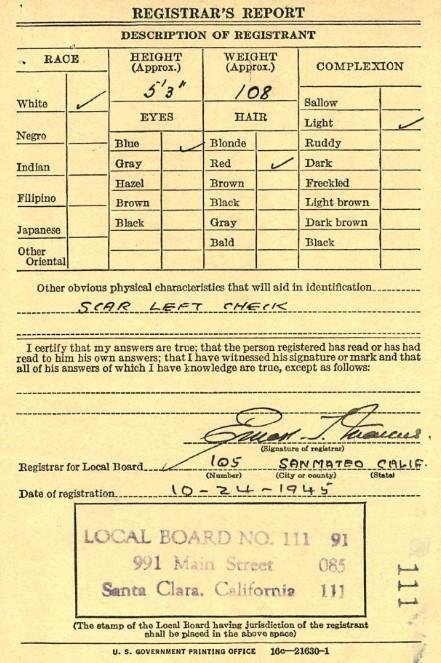 As for his height: Draft Cards from 1946 & 1948 list him as 5'3" and 5'7" respectively. His 1962 "felony" conviction for narcotics, marijuana were part of one of his divorces. He died young, at the age of 42. His death certificate states that cause of death was "acute barbiturate intoxication" (suicide; he took overdose of sleeping capsules). |