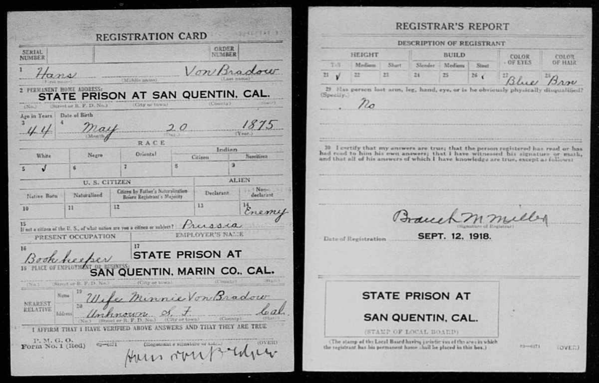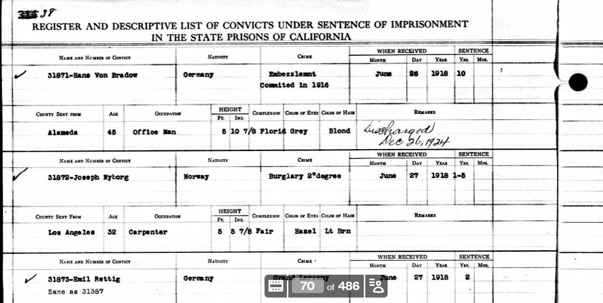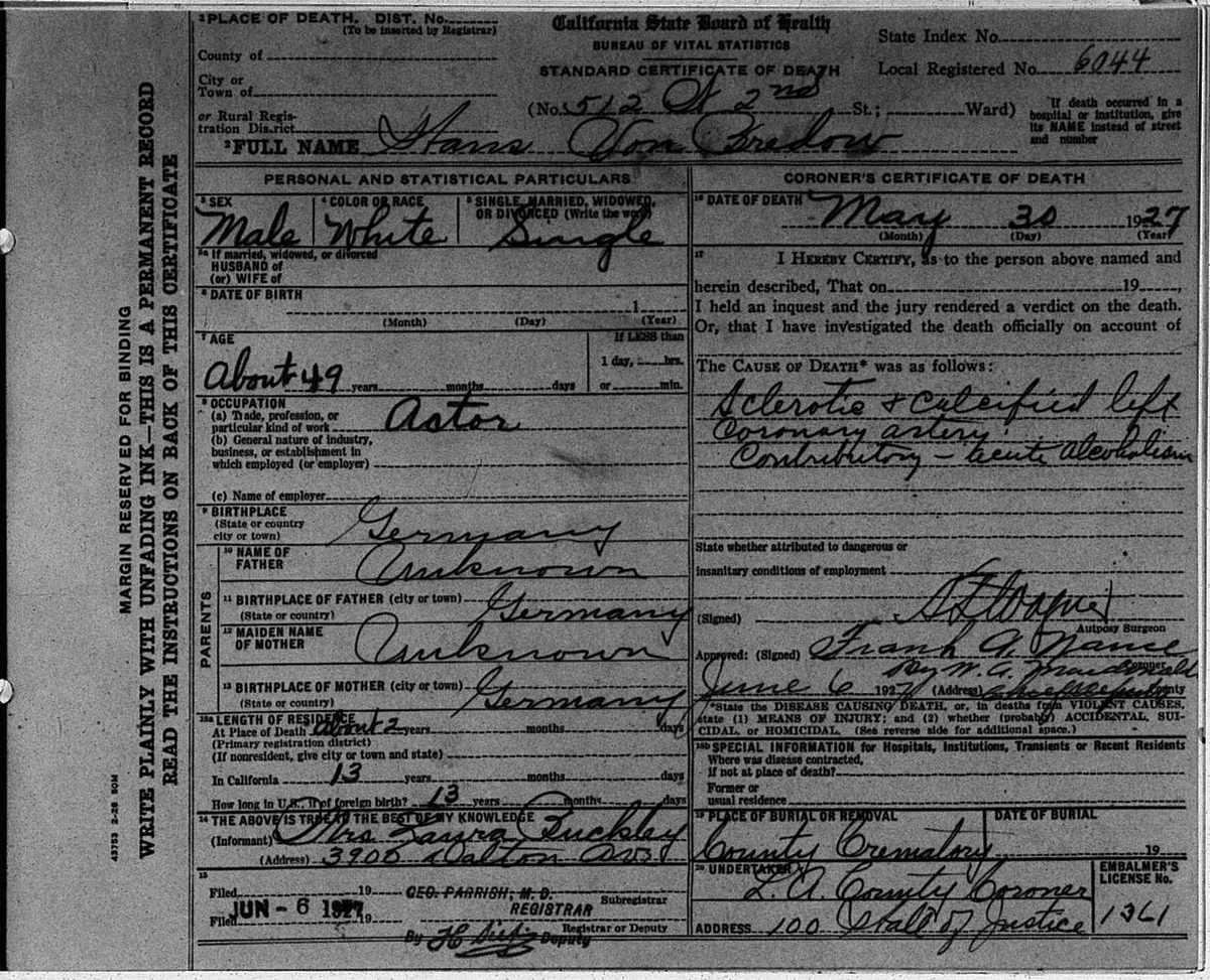 Balding, stout German actor and extra. Various sources and reports also spell his surname "Von Bradow," "Van Bredow," or "Van Bradow." Per later reports, Von Bredow was allegedly the disinherited son of a wealthy German baron, and later served as a lieutenant in the German Army. On his 1916 marriage certificate, Hans gives his name as Freiherr Hans J. Von Bredow, and his parents' names as Freiherr Johchimore [sp?] Bredow (certificate omits the "Von"; unknown if intentional) of Berlin, Germany, and Carolina Von Bredow of Brandenburg, Germany. In the 1920 U.S. Census, Hans says he immigrated to the United States in 1901. On 7 July 1909, he married Minnie (Johnson) Nelson (b. 1869; d. after 1942) in Chicago, Illinois. His death certificate (1927) claims he was in California for 13 years, putting his arrival in the "Golden State" at around 1914. In January 1916, he was arrested in Los Angeles and returned to Oakland, California, on a charge of embezzlement committed in November 1914. He reportedly stole $754.75 from his friend and employer, Ferdinand Schultz of the Hofbrau Café, where Von Bredow was employed as a steward. Von Bredow initially claimed that he was framed by a wealthy widow from Oakland whose love he had scorned, and whose name he made a show of refusing to disclose; he later claimed that his actions "was caused by a fit of mental depression due to brooding over a wound in his eye." Reports of the time mention Von Bredow's time as a German Army lieutenant and Schultz's claim that Von Bredow was a disinherited son of a wealthy German baron; at the time, Von Bredow declined to discuss his past. Schultz also said that Von Bredow had a wife (Minnie) who worked as a maid in a San Francisco hotel for the last three years, and that she helped support her husband before he began working at the Hofbrau. Von Bredow was released in June 1916 on five years' probation, having made complete restitution of the money thanks to Wilhelm Von Brincken, a member of the German Consulate of San Francisco and fellow future film actor, who served as a character witness for Von Bredow. On 16 November 1916, he married German-born Minna R. Kellogg (1867-1918), who ran a Los Angeles employment agency, in Santa Ana, California. On 26 April 1918, during World War I, he was arrested again on suspicion of being the head of a ring of German spies. It was alleged that Von Bredow used his wife's employment agency to "plant" various German spies and agents to obtain valuable information, including attempting to acquire blueprints of American artillery weapons. Minna R. Kellogg-Von Bredow, who had successfully ran the bureau for eleven years prior, initially believed in Hans' innocence, but ultimately could not live with the shame of having her own loyalty questioned (she was German-born, though she had resided in California for some years, and friends testified to her loyalty to the U.S.) nor being betrothed to a suspected enemy alien; she committed suicide on 3 May 1918 by inhaling gas from an open jet. Authorities also obtained further evidence that Von Bredow was guilty of bigamy, as he had reportedly not obtained a divorce from his previous wife, Minnie, living at 1720 Geary Street, San Francisco. Later reports add mention of a child as well; Minnie's 1918 registration affidavit mentions one son, Harold Birger Nelson (1898-1967), from a previous marriage. In mid-May, papers reported Von Bredow fiercely boasting of his predictions of German world dominance, including that Mexico would declare war on the United States within the next 12 months, and that an alliance between Germany, Japan, and Mexico would coalesce within the next two years. Von Bredow was ultimately convicted of violating his parole for the 1916 embezzlement arrest. By this time (late June), Von Bredow tried to claim that an operation to remove a bullet from his head (received in a gun duel in Germany 17 years prior) was to blame for a poor mental state including blackouts and severe headaches, even claiming that this led to him living something of a dual life and that he had no memory of marrying Mrs. Kellogg; Von Bredow also claimed to be disgusted with Germany and denied that he ever went against his adopted homeland. Judge James G. Quinn disagreed with Von Bredow's pleas for leniency, and Von Bredow was given a ten-year sentence; federal authorities requested that if the sentence expired before the end of the war, then Von Bredow be handed over to them for internment. Von Bredow began serving his sentence at San Quentin State Prison on 26 June 1918. His prison records give his personal statistics as thus: he stood 5' 10 7/8", weighed 198 lb., and had blonde hair, grey eyes, and a florid complexion. Von Bredow was ultimately paroled on 2 May 1923, after serving less than five years, and was fully discharged on 26 December 1924. (Incidentally, Wilhelm Von Brincken, who had previously helped out Von Bredow during his earlier 1916 arrest, would also be convicted of espionage activities and imprisoned for two years during World War I.) Von Bredow worked as a film extra for the last three years of his life, working for Lasky's (Paramount) and First National among other studios. On 30 May 1927, Von Bredow was found dead in his room in a boarding house at 512 West 2nd St., Los Angeles, by the landlady. Evidence in the room pointed to his death being caused by acute alcoholism; his death certificate gives his cause of death as "Sclerotic & calcified left coronary artery; Contributory - acute alcoholism." His death came nearly six months after he filmed his scenes in "A One-Mama Man," and only less than three months after the film's release. |