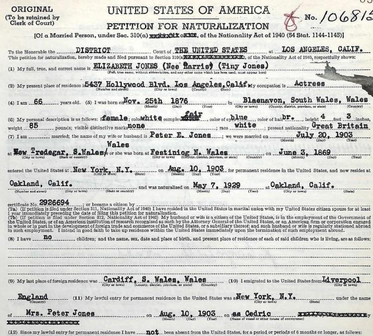 Pint-sized Welsh actress. Records mentioning her birth vary from 1871 when she and her husband Peter E Jones (a miner) were passengers on the SS Germanic from Liverpool, England (born Wales) to Slatington, Lehigh County, Pennsylvania on July 19, 1903 to 1881 in the 1940 US Census (age 61). The 1950 US Census and her CA Death Certificate both give a birth year of 1875. In 1943, for her US Citizenship Application (under oath), she says she was born "26 November 1876". She also says she sailed on the "Cedric". I think this was a memory error of many years and actually the Germanic. The earliest mention of her age I've found is the 1903 passenger's list on the SS Germanic which would indicate an 1870 birth year. In her 1943 citizenship application she legally changed her first name to "Tiny". |