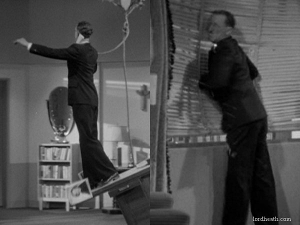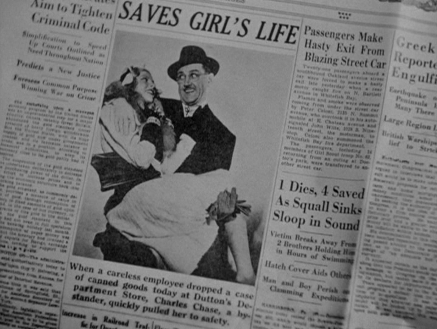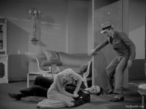 As Charley untangles himself from the rope he realizes that he has landed in the apartment owned by Maisie, the lady he saved from the bakery store. After explaining what has happened Charley turns to Louie (her gangster boyfriend) and begs him to shoot him. Louie eventually agrees to help Charley out and instructs his goon to take care of Charley, but Charley insists on his end being by surprise and not face-to-face. Louie enquires as to the brand of tobacco Charley is smoking in his pipe, little realising a bullet has got lodged inside it and when he takes a puff, the pipe explodes in Louie's face. Charley makes a quick exit and finds Edith in his apartment where she embraces Charley as a hero after another newspaper article claims he saved Maisie's life in the store earlier. The couple kiss and make up and Edith leaves. Charley snaps out of his suicidal thoughts but when he hears a car misfiring down below he thinks it is Louie after him with a gun and so he runs back out of his apartment. In the corridor a young boy lets off a box of firecrackers, adding to Charley's strained nerves. Charley knocks on Louie's door to call off the killing request but Maisie tells him Louie is not at home. He asks Maisie to return the wedding ring he gave to her earlier but when she refuses the two of them end up rolling around on the floor for it just as Louie returns home. Louie tries to attack Charley but is unsuccessful. His goon also enters the room and he too gets outsmarted by Charley, who climbs back out of the window, up into his apartment, grabs Edith and leaves for China! |