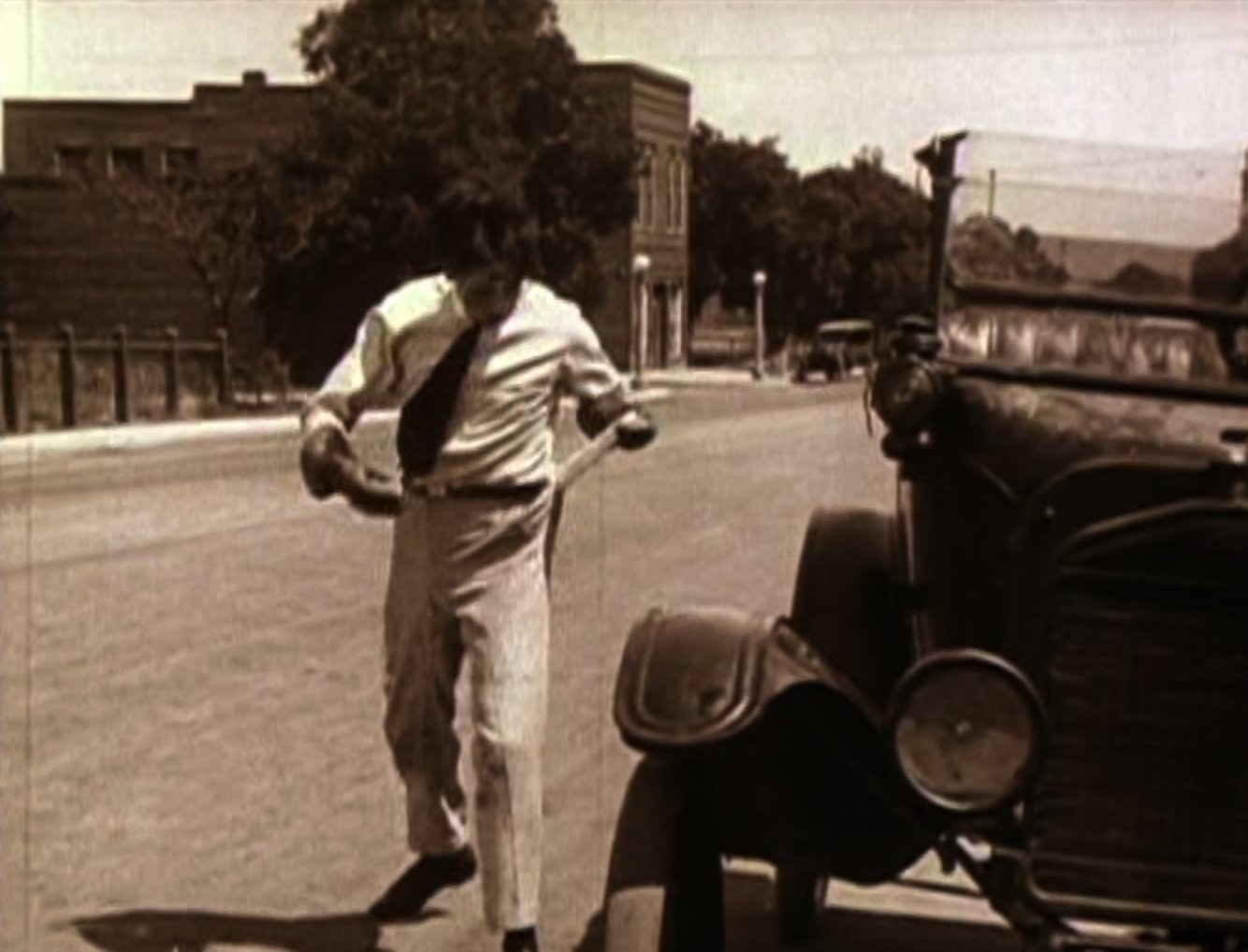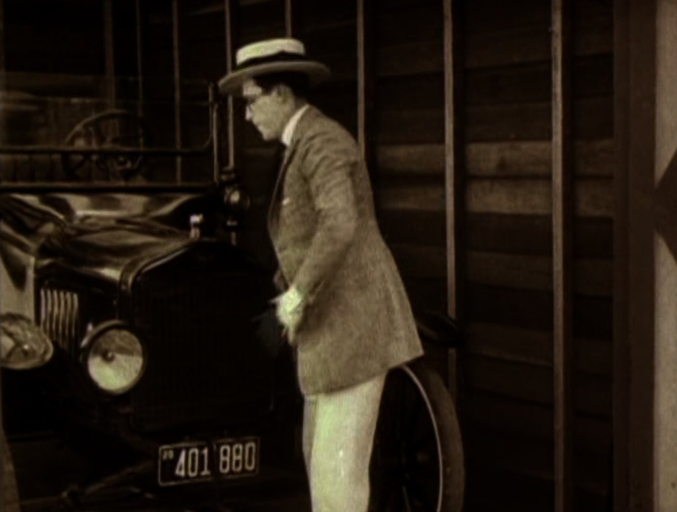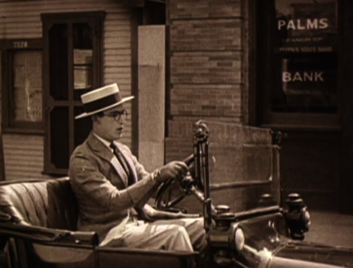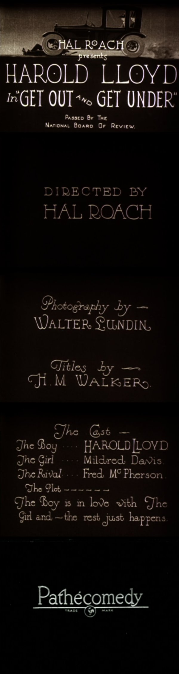 Harold is having his portrait taken when he is first distracted by a fly on his nose, and then a mouse that crawls up his trouser leg. Harold shows the photographer a picture of his sweetheart (MILDRED DAVIS) but when the photographer sees it he tells Harold that the same girl told him she was getting married that very morning. Harold rushes to the ceremony but is too late. The next day (presumably?) Mildred phones Harold up to tell him to come over to rehearsals. Harold spends some time admiring his almost-paid-for automobile that he keeps locked in his garage when he gets into a spat with his neighbor (which to be fair Harold is the blame for), which culminates in Harold backing his precious car into the neighbor's garden before driving off with a smug look on his face. En route to his location Harold drops his bag out of the car and has to retrieve it by jumping out whilst the vehicle is still moving before coming to a stop outside a bank. As the theatre members start the show without Harold on account of him being late, Harold curses at his beloved car in the street, covering the ears of a lady pedestrian as she walks past. A young boy (ERNEST MORRISON) shows up with an enormous amount of curiosity, getting in Harold's way as he examines the problem with the car. Harold repeatedly shoves him aside but the boy manages to get the car started by jumping up and down on it. Harold then gets under the car to fix it where he is greeted by a dog who gets in his way. When Harold gets up, he then climbs into the bonnet and is once again pestered by the young boy who drops his ice cream on Harold's head. |