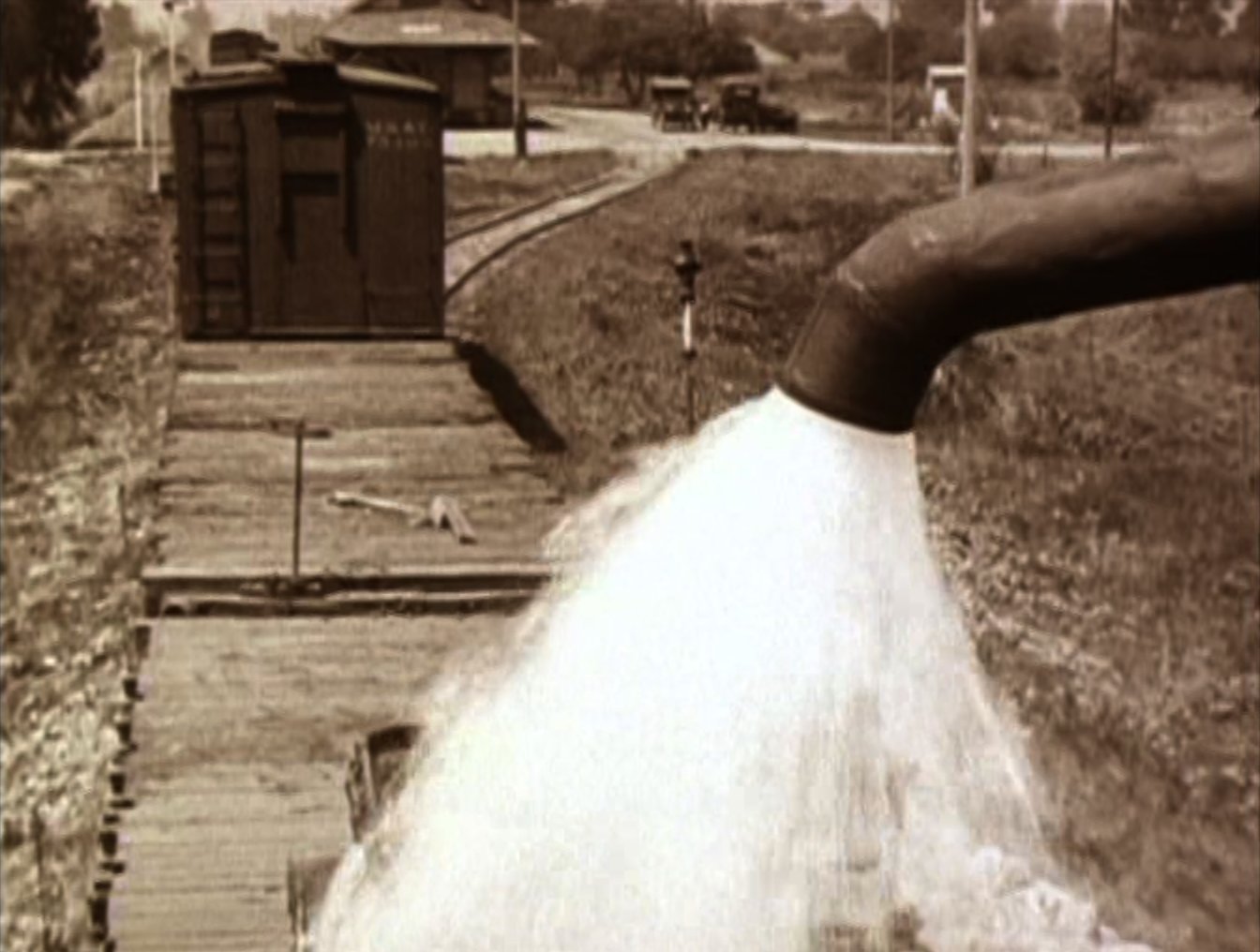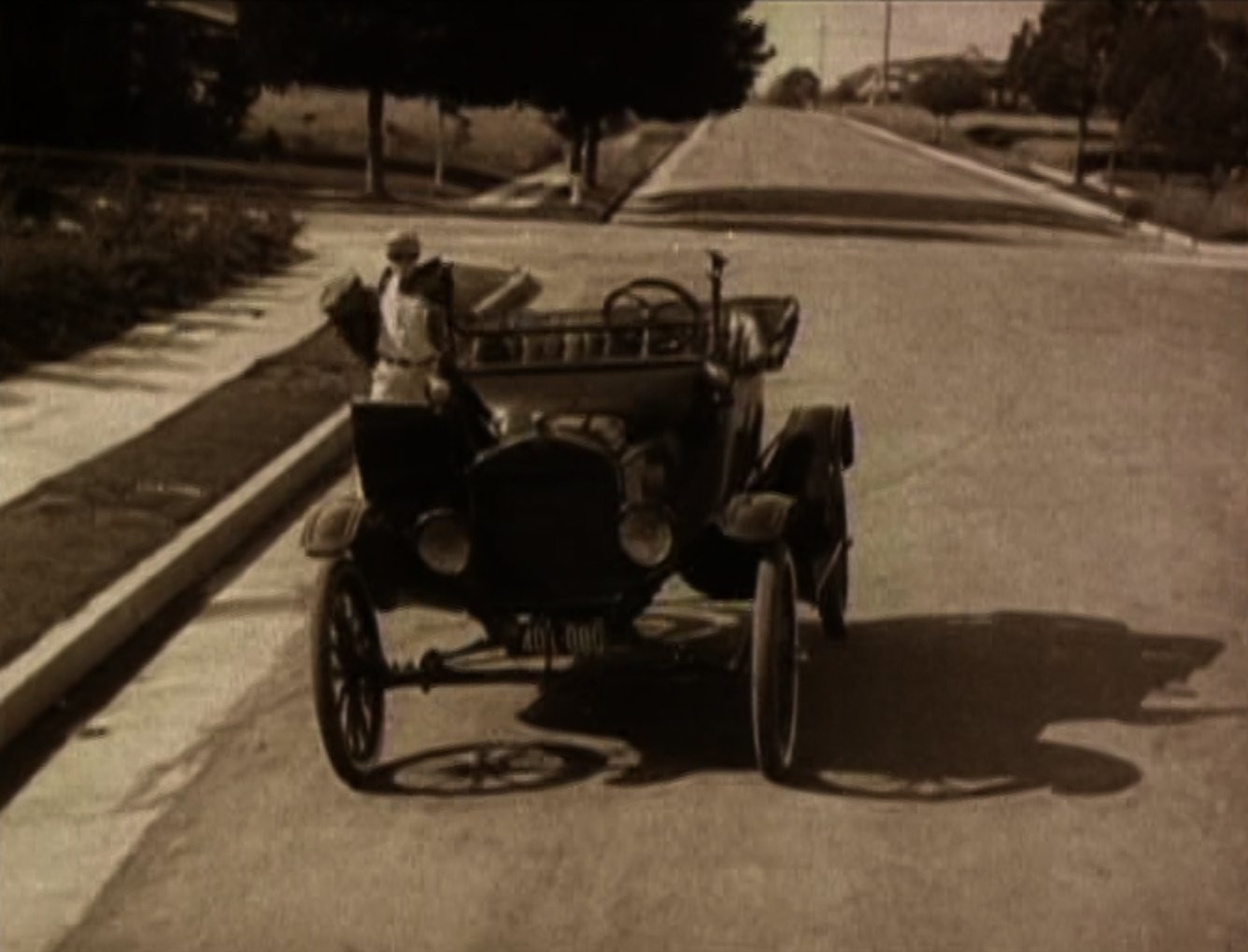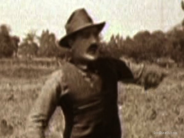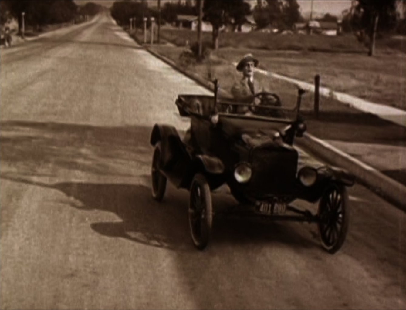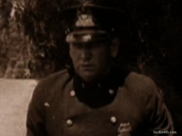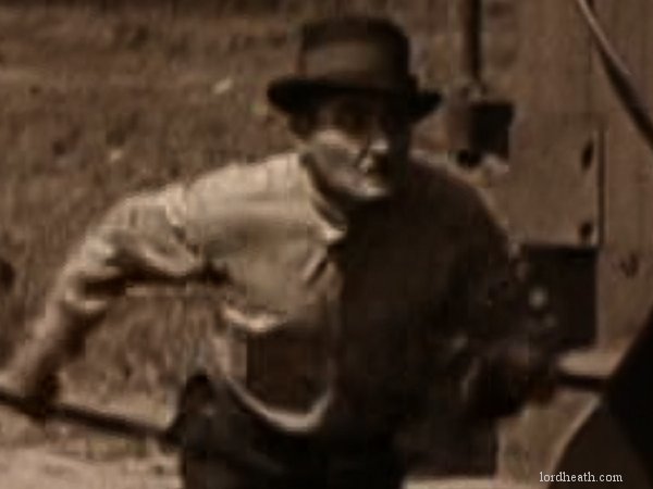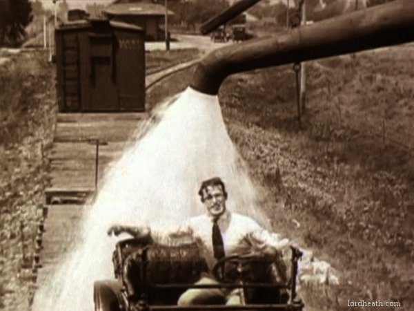An opium addict (WILLIAM GILLESPIE) walks past and injects himself with some of the bad stuff. Harold sees him and discretely robs him of his needle, before using it to inject his automobile, bringing it to life instantly! Harold then has to run off down the road to catch up with the runaway car! Harold re-boards his precious car and drives it onto the back of a train. After a while the train stops to take on water, and Harold gets absolutely drenched (see favourite bit). Three railroad employees physically throw Harold off the train, followed by his car! Harold gets back in the car and speeds off but is soon pursued by some motorcycle cops. He uses clever ruses to throw the cops off his trail, for example driving down a closed-off road and hiding in the back of a removal van. Harold then drives his car into a tent before driving off with it covering his car (very clever). He catches up to the back of a streetcar and attaches the tent to it. As the police chase the streetcar, Harold is able to escape and head for the theatre, where the stage show is already under way. When he gets there he finds that his rival has donned Harold's costume and is taking his place in the show. Harold disposes of the rival and takes to the stage where he is asked to reveal his identity. Harold removes the mask he has put on and receives applause from the audience. He and Mildred leave and get into his car, and after breaking free from the fire hydrant Harold had chained it to, they drive off leaving a bunch of theatre patrons who have ventured out into the street covered in the spray from it. |
