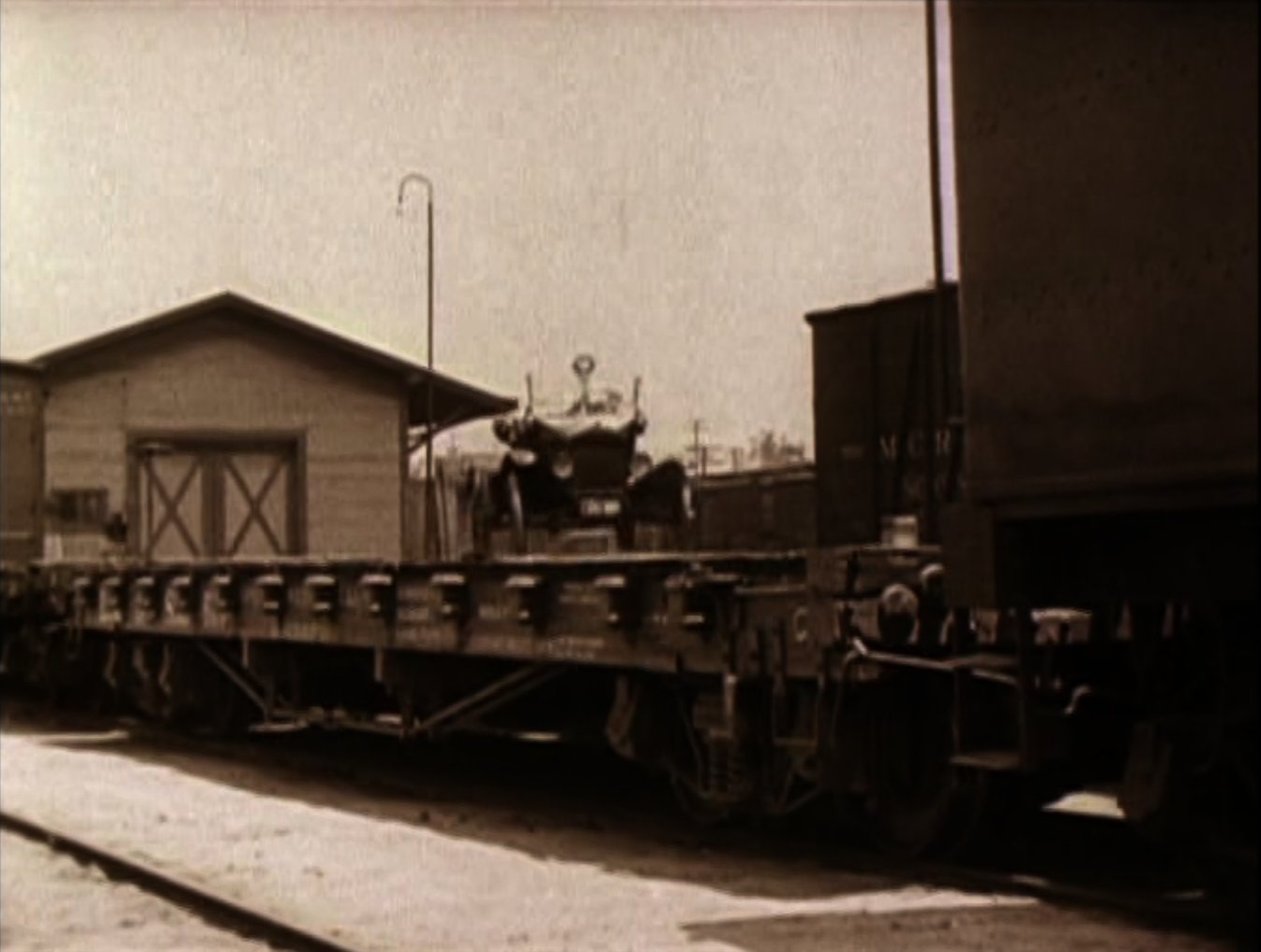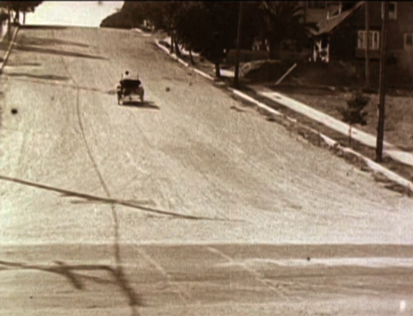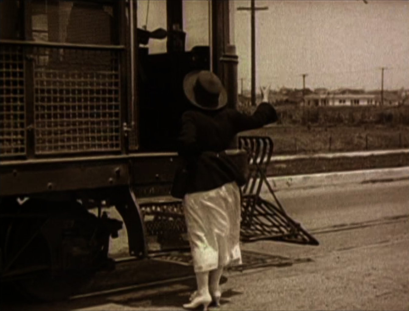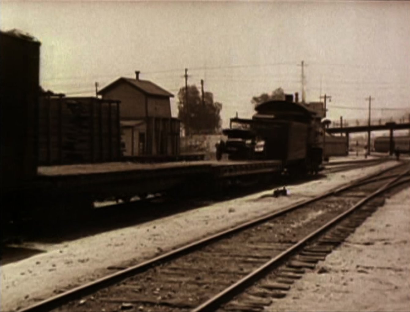 An opium addict (WILLIAM GILLESPIE) walks past and injects himself with some of the bad stuff. Harold sees him and discretely robs him of his needle, before using it to inject his automobile, bringing it to life instantly! Harold then has to run off down the road to catch up with the runaway car! Harold re-boards his precious car and drives it onto the back of a train. After a while the train stops to take on water, and Harold gets absolutely drenched (see favourite bit). Three railroad employees physically throw Harold off the train, followed by his car! Harold gets back in the car and speeds off but is soon pursued by some motorcycle cops. He uses clever ruses to throw the cops off his trail, for example driving down a closed-off road and hiding in the back of a removal van. Harold then drives his car into a tent before driving off with it covering his car (very clever). He catches up to the back of a streetcar and attaches the tent to it. As the police chase the streetcar, Harold is able to escape and head for the theatre, where the stage show is already under way. When he gets there he finds that his rival has donned Harold's costume and is taking his place in the show. Harold disposes of the rival and takes to the stage where he is asked to reveal his identity. Harold removes the mask he has put on and receives applause from the audience. He and Mildred leave and get into his car, and after breaking free from the fire hydrant Harold had chained it to, they drive off leaving a bunch of theatre patrons who have ventured out into the street covered in the spray from it. |