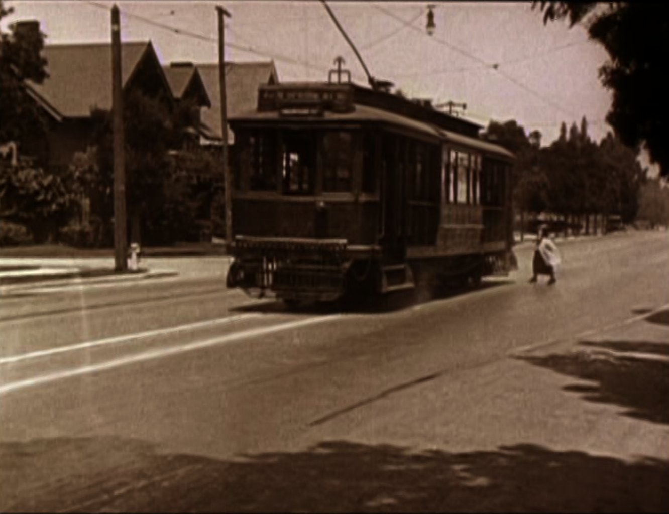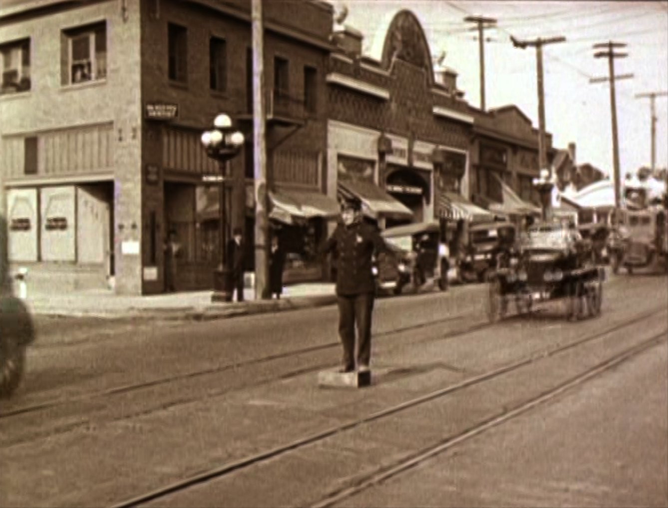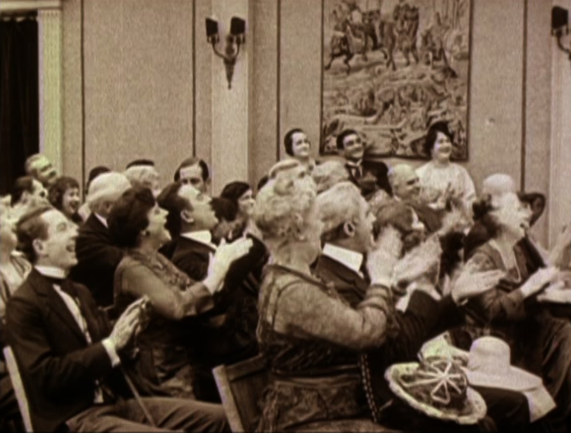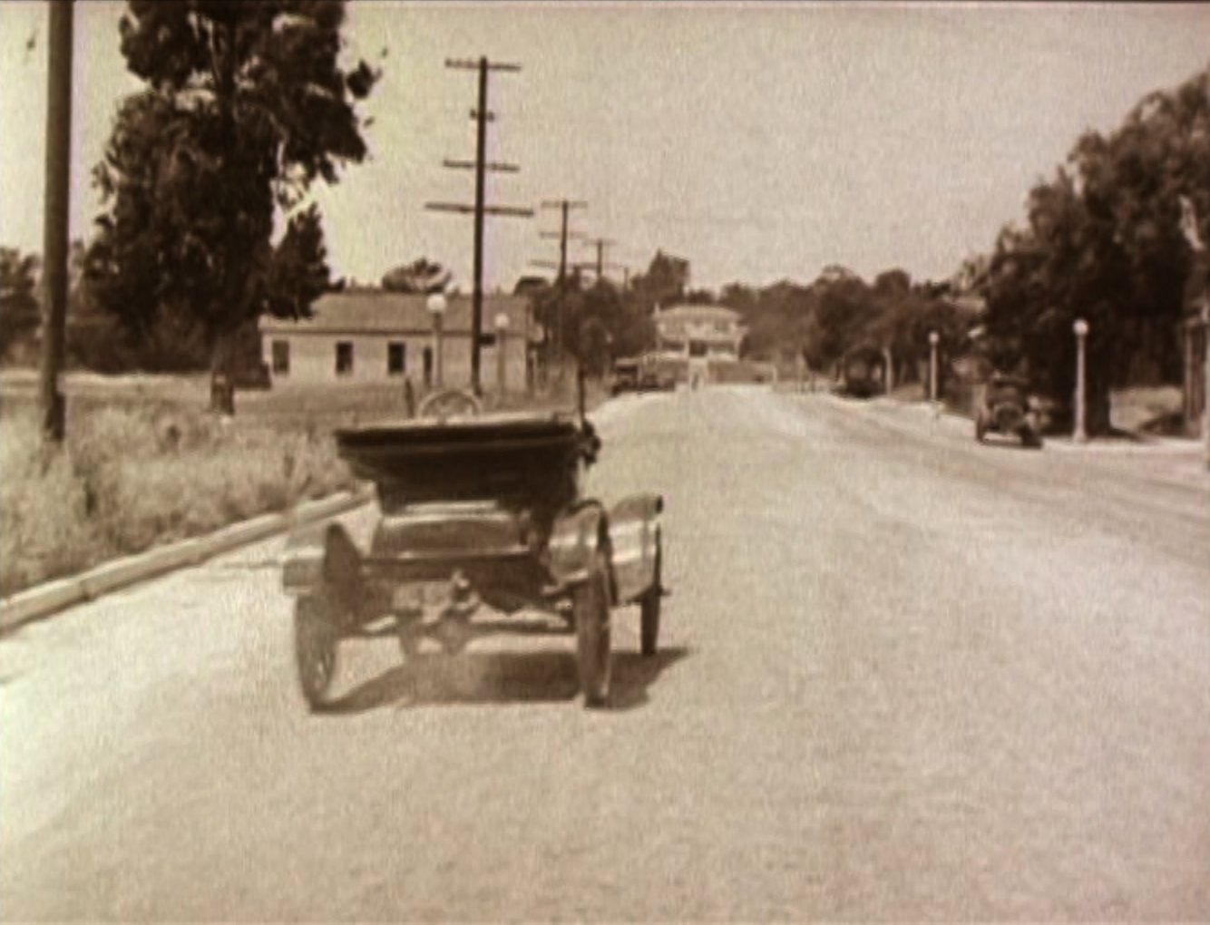An opium addict (WILLIAM GILLESPIE) walks past and injects himself with some of the bad stuff. Harold sees him and discretely robs him of his needle, before using it to inject his automobile, bringing it to life instantly! Harold then has to run off down the road to catch up with the runaway car! Harold re-boards his precious car and drives it onto the back of a train. After a while the train stops to take on water, and Harold gets absolutely drenched (see favourite bit). Three railroad employees physically throw Harold off the train, followed by his car! Harold gets back in the car and speeds off but is soon pursued by some motorcycle cops. He uses clever ruses to throw the cops off his trail, for example driving down a closed-off road and hiding in the back of a removal van. Harold then drives his car into a tent before driving off with it covering his car (very clever). He catches up to the back of a streetcar and attaches the tent to it. As the police chase the streetcar, Harold is able to escape and head for the theatre, where the stage show is already under way. When he gets there he finds that his rival has donned Harold's costume and is taking his place in the show. Harold disposes of the rival and takes to the stage where he is asked to reveal his identity. Harold removes the mask he has put on and receives applause from the audience. He and Mildred leave and get into his car, and after breaking free from the fire hydrant Harold had chained it to, they drive off leaving a bunch of theatre patrons who have ventured out into the street covered in the spray from it. |