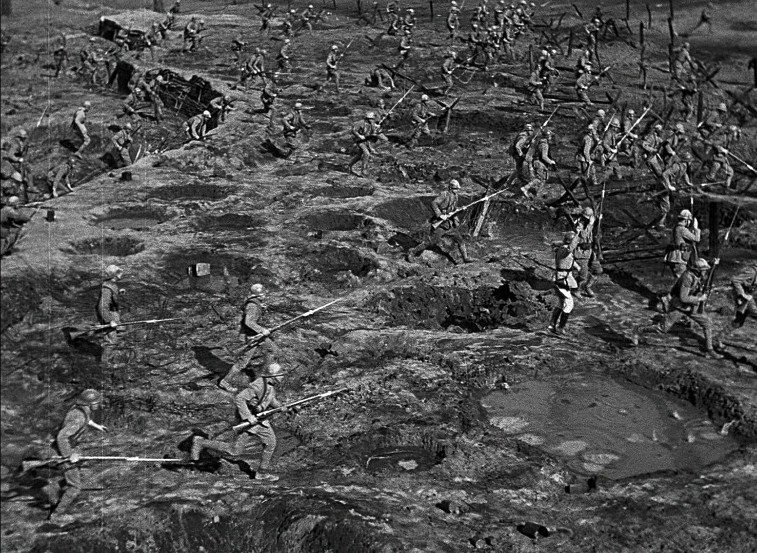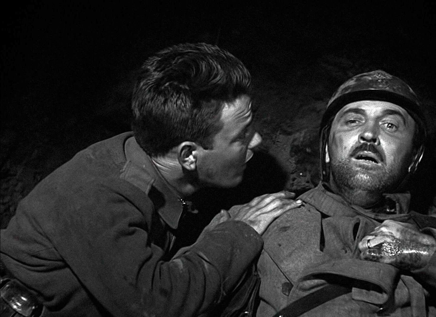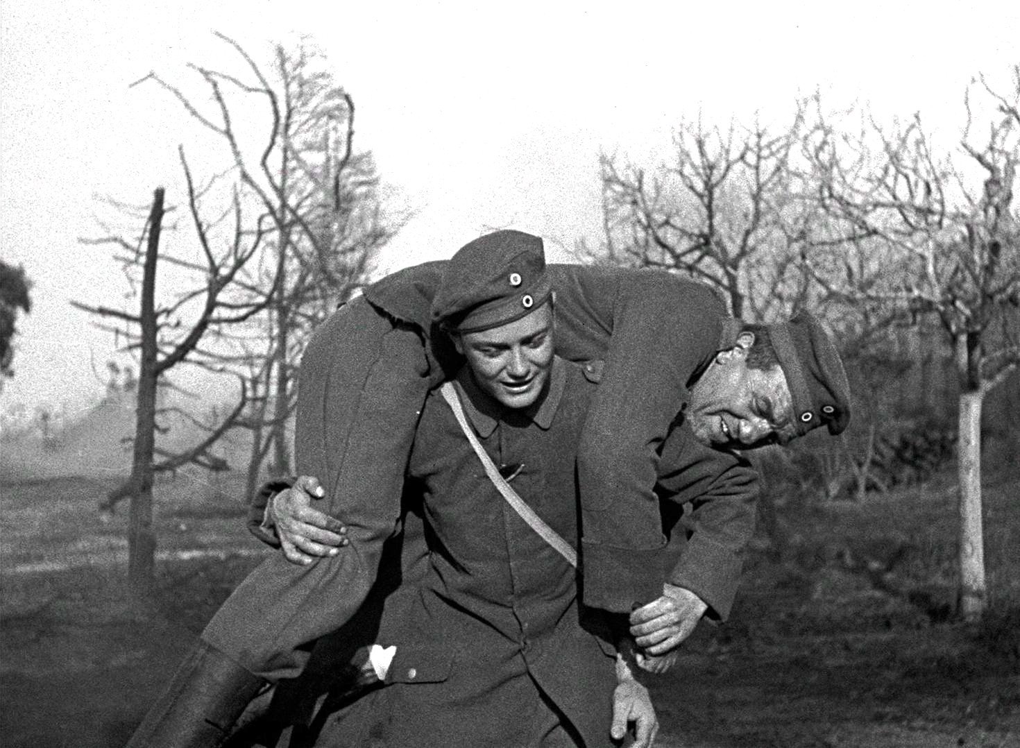 Paul Bäumer (LEWIS AYRES) trying to explain and reason with the German soldier (RAYMOND GRIFFTH) he has mortally wounded during one of the battle scenes. Paul is full of remorse for killing the rival soldier and asks for forgiveness. It's one of the most moving scenes in the film.