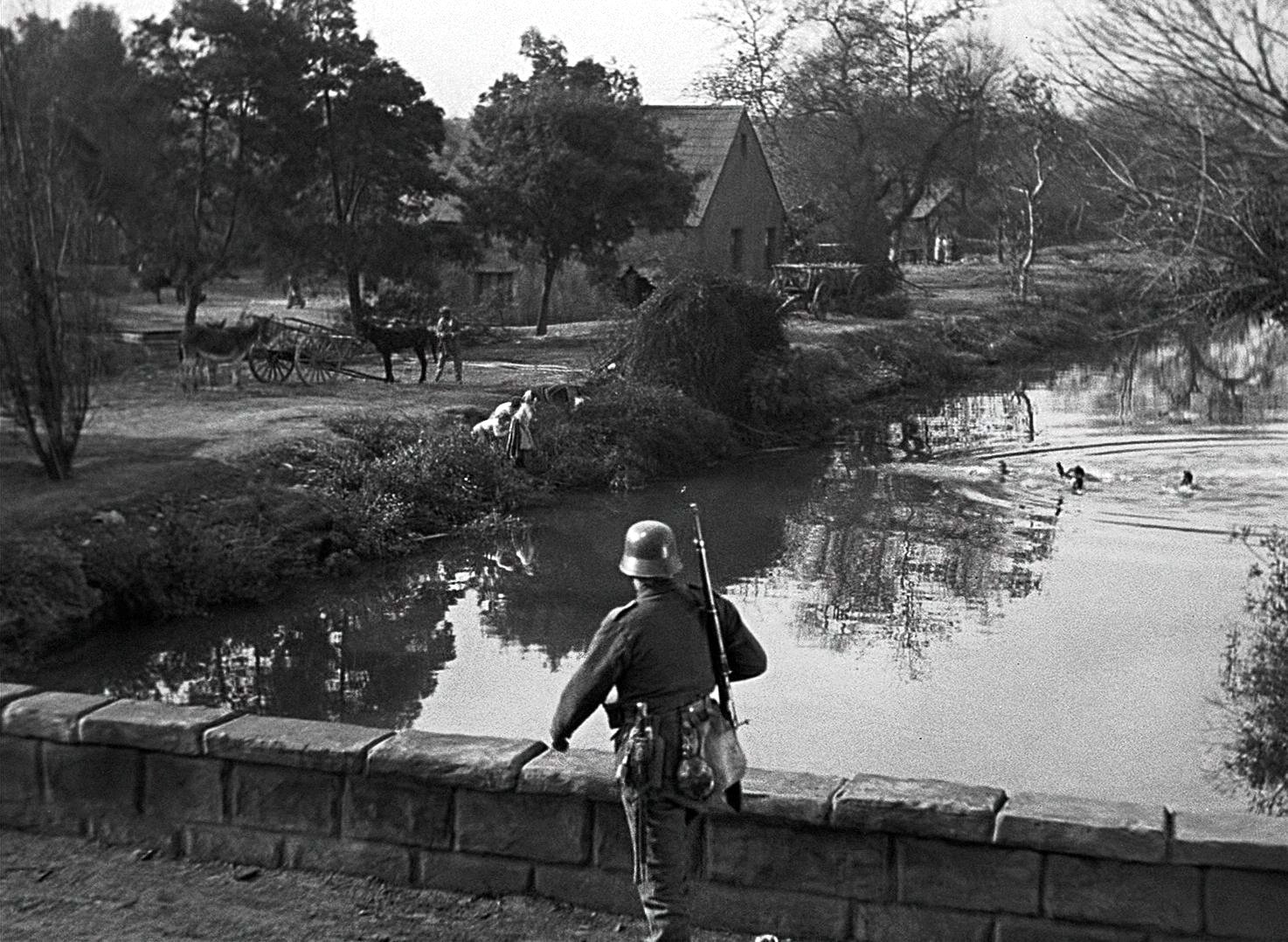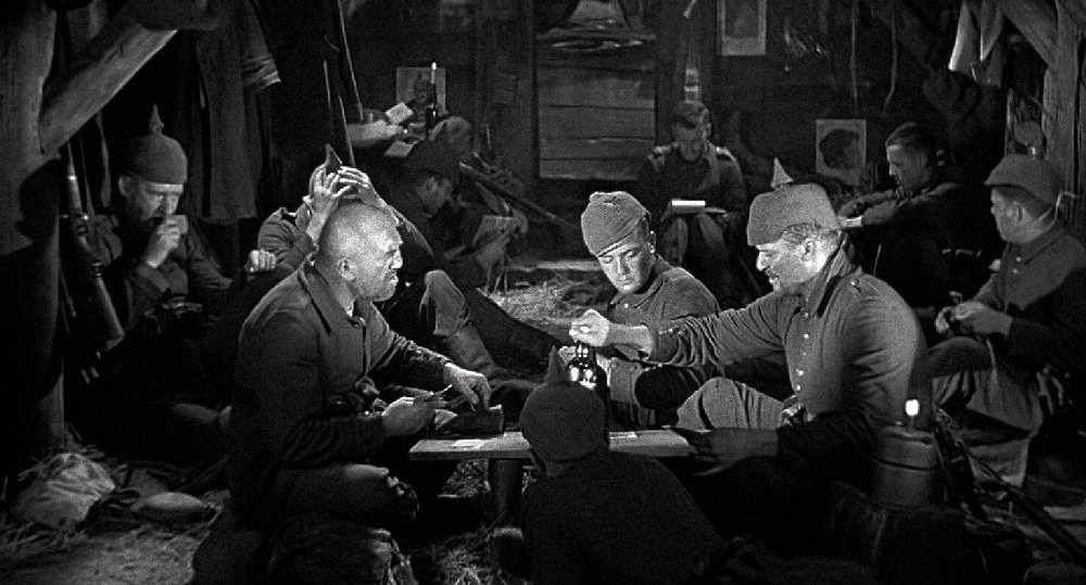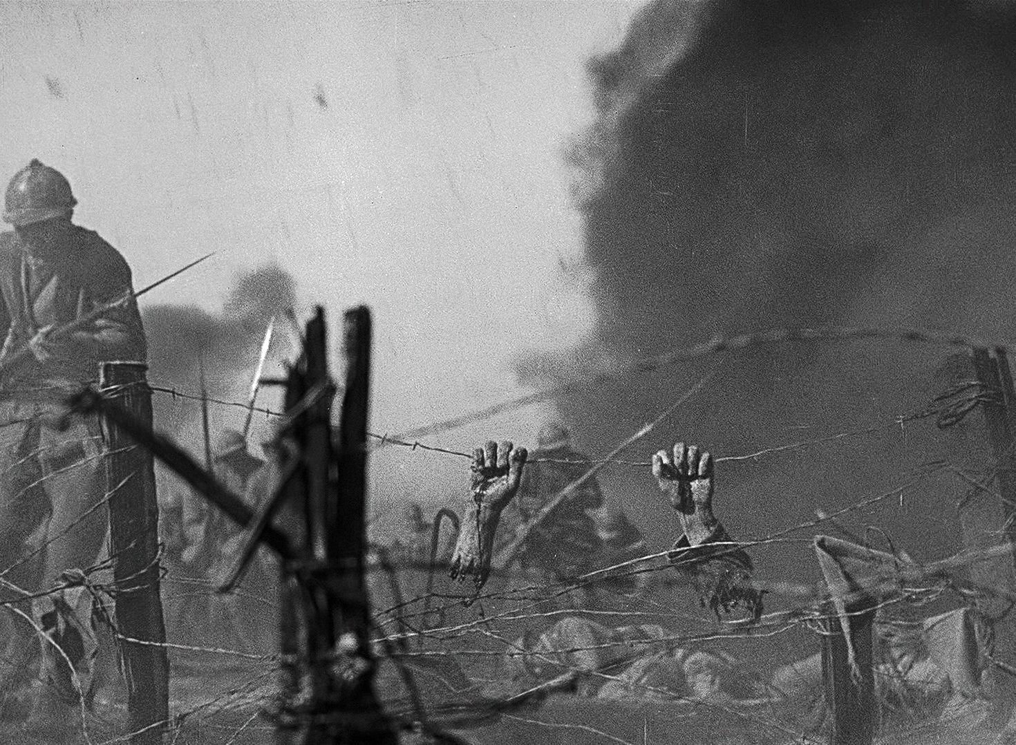 Paul Bäumer (LEWIS AYRES) trying to explain and reason with the German soldier (RAYMOND GRIFFTH) he has mortally wounded during one of the battle scenes. Paul is full of remorse for killing the rival soldier and asks for forgiveness. It's one of the most moving scenes in the film.