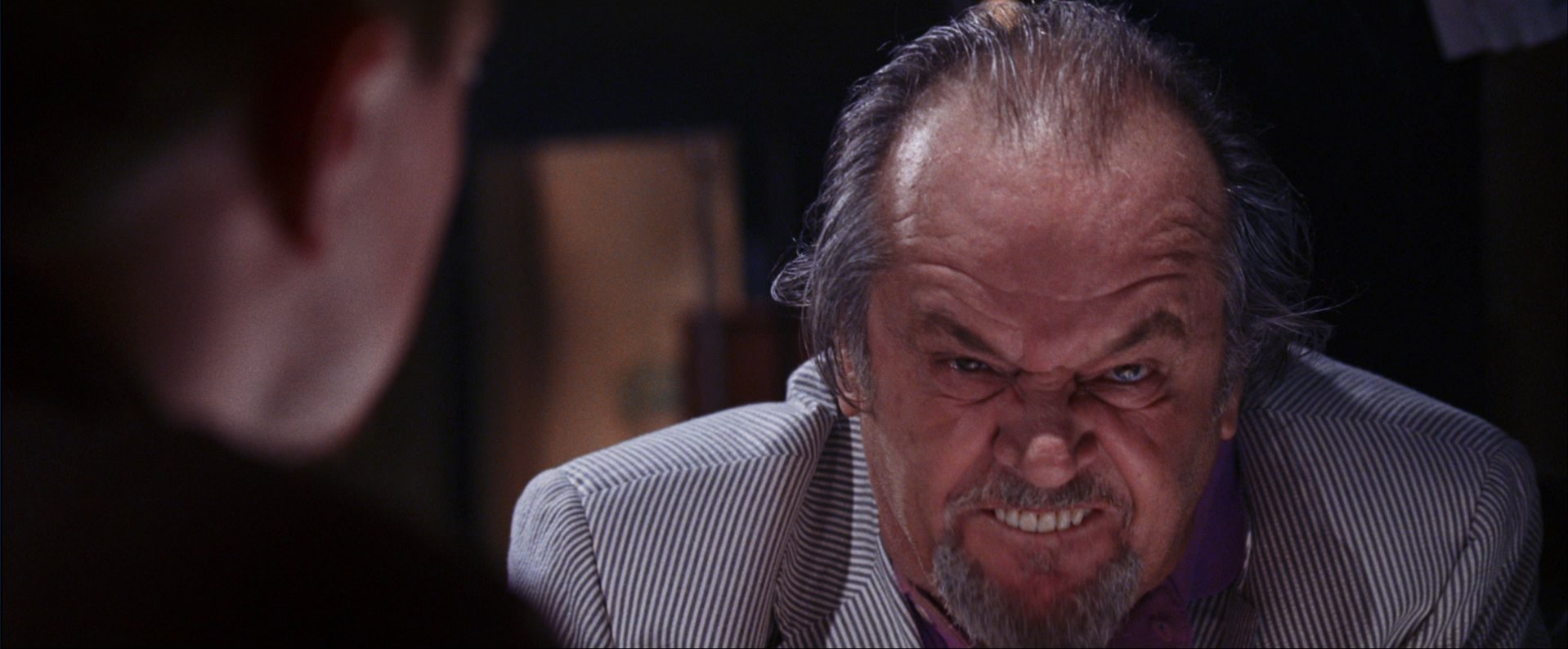Jack Nicholson producing a black rubber dildo in the porn theatre and his line: "Maybe because it's always been so easy for me to get cunt, that I never understood jacking off in a theatre." Only Jack!