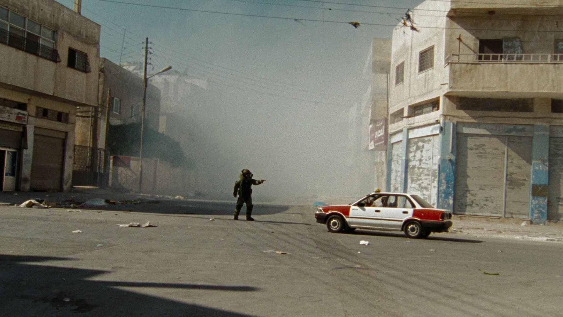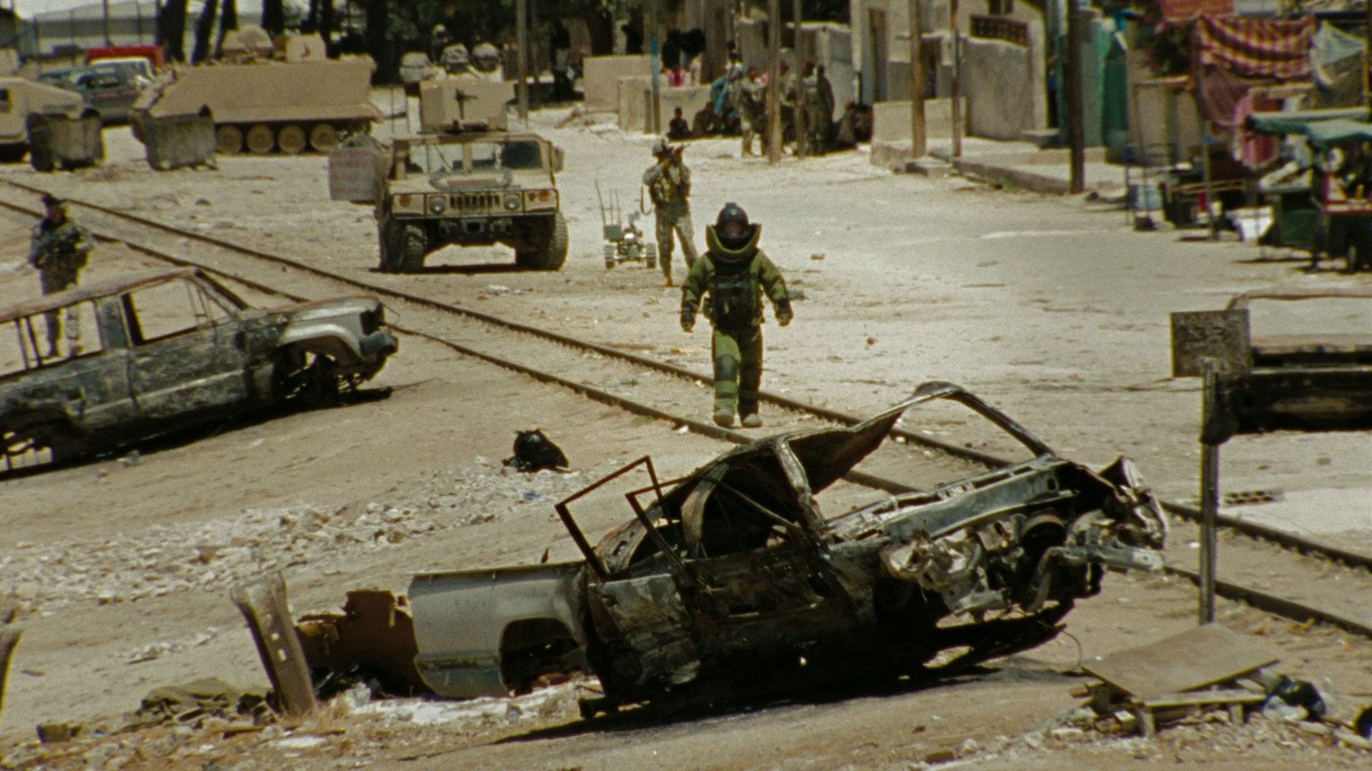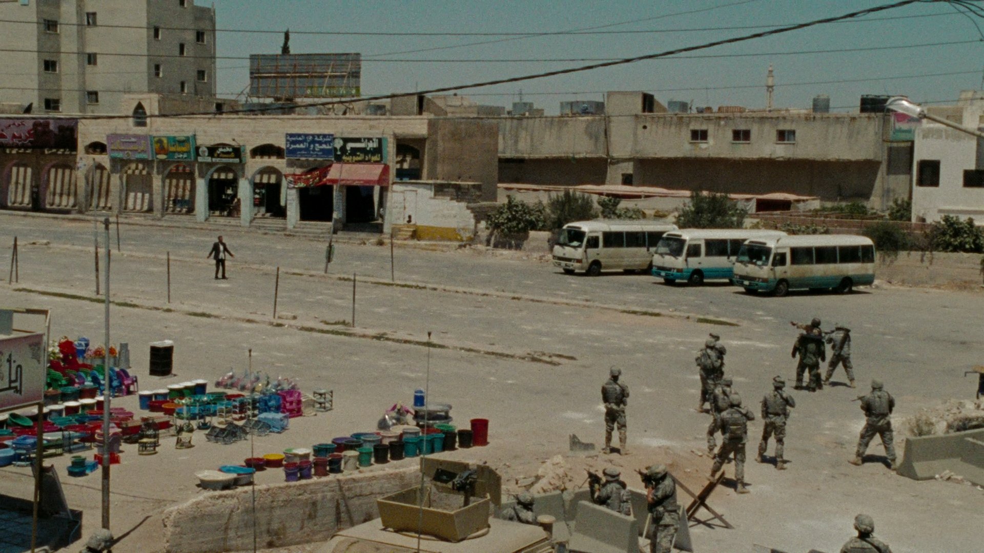 It starts with promise but soon wears out its initial welcome. The first 10 minutes really grabs your attention and hold it firmly in its grip. The one recurring theme throughout the film is an incredible amount of sustained suspense. Some of the scenes feel a little predictable, such as the opening section when the soldiers are acting too casual and joking which made me think they need a reality check. And then they got one! The middle section of the movie falls away somewhat as the story starts to sag from a lack of action, blending into mediocrity. It picks up again in the final 20 minutes or so with one of the most memorable moments when a man pleads for his life in the middle of the street with a ton of explosives attached to his chest.